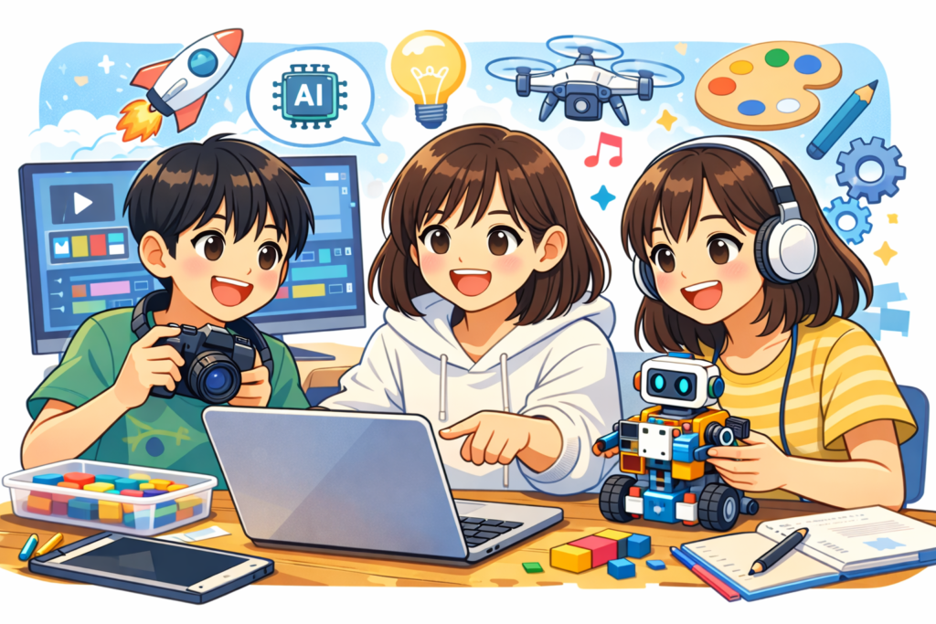 動画制作やAI、デザインなど、子どもたちが興味を持ったことから活動が始まります。